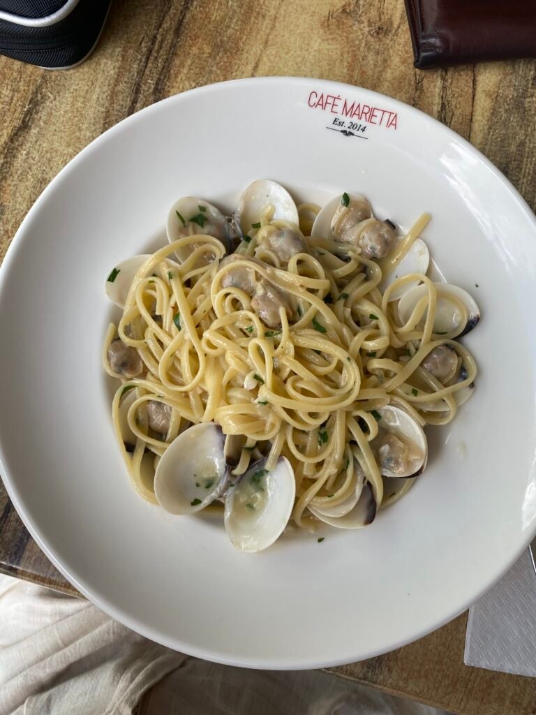 - Toss in spaghetti + splash of pasta water; add parsley; season; finish with lemon.