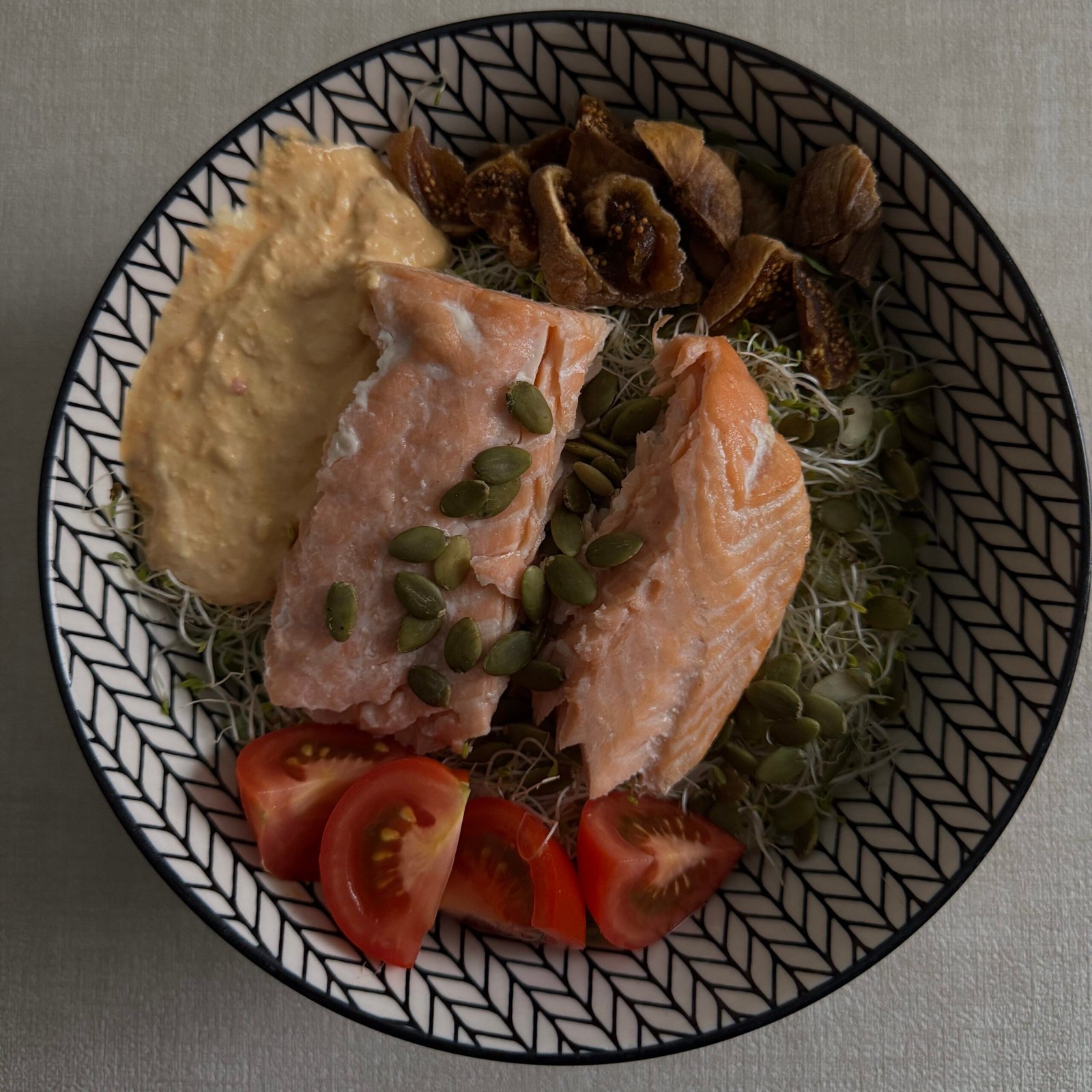 • 3 oz raw or lightly seared salmon (omega-3 = anti-inflammatory, great for sleep & fat burning)